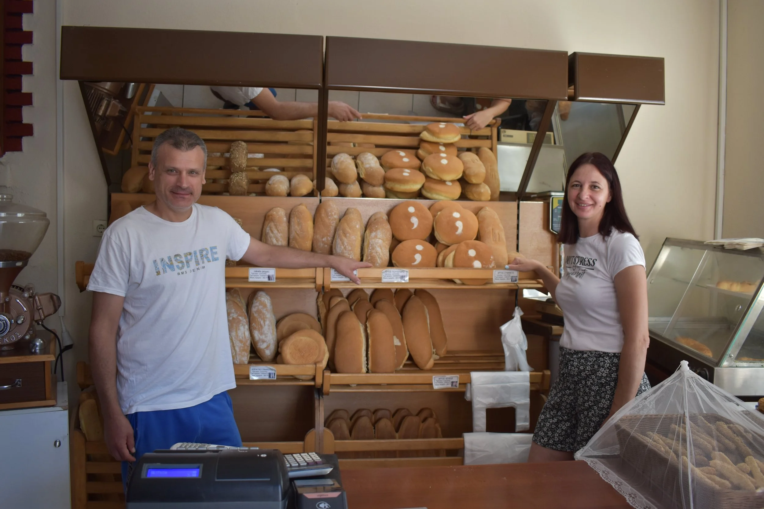 Chris and Maria, in their bakery with the special loaves. The semi - colon that decorates the loaf is the question mark symbol in Greek